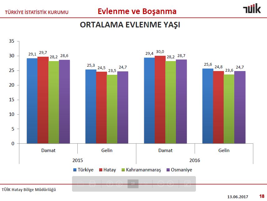 Kahramanmaraş’ta 2014 yılında binde 7.9 olan kaba evlenme hızı, 2015 yılında hızlı bir yükselişle binde 8.1 oldu; ancak 2016 yılında bu ortalama binde 7.6’ya kadar düştü. Kahramanmaraş’ın da aralarında bulunduğu TR63 bölgesi içinde en genç evlenmeler hem gelin hem damat olarak Maraş’ta görülüyor. 2016 yılında, Türkiye genelinde ortalama evlenme yaşı damatlarda 29.4 iken; gelinlerde 25.6 oldu. Bu ortalama Kahramanmaraş’ta damatlarda 28.2 gelinlerde ise 23.6 olarak görüldü. Kahramanmaraş’ta, kaba boşanma hızında 2014 yılından bu yana düzenli düşüşler yaşanırken; grup illeri arasında Osmaniye’de 2016 yılında ciddi bir artış yaşandı.