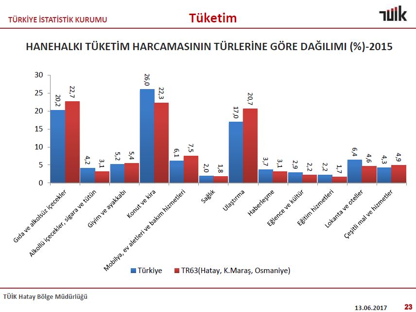 2015 yılında hane halkı tüketim harcamasının türlerine göre dağılımına bakıldığında TR63 Bölgesinde en fazla harcama yüzde 22.7 ile gıda ve alkolsüz içeceklerde yaşanmış. İkinci olarak en fazla harcama yüzde 22.3 ile konut ve kiraya yapılmış. Bunu; yüzde 20.7 ile ulaştırma, yüzde 7.5 ile mobilya ev aletleri ve bakımı, yüzde 5.4 ile giyim ve ayakkabı, yüzde 4.9 ile çeşitli mal ve hizmetler, yüzde 4.6 ile lokanta ve oteller, yüzde 3.1 ile haberleşme ve alkollü içecekler sigara-tütün, yüzde 2.2 ile eğlence ve kültür, yüzde 1.8 ile sağlık, yüzde 1.7 ile eğitim hizmetleri takip etti.