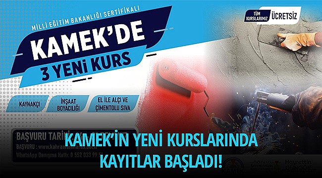 Kahramanmaraş Büyükşehir Belediyesi’nin Meslek Edindirme ve Sanat Eğitimi Kursları’nda (KAMEK) deprem sonrası yeni dönem eğitimleri sürüyor. 28 farklı branşta düzenlenen eğitimlere 3 yeni kurs daha ekleniyor. Kaynakçı, İnşaat Boyacılığı ve El ile Alçı ve Çimentolu Sıva kurslarına kayıtlar başladı. Büyükşehir Belediyesi’nin internet adresinden (https://kahramanmaras.bel.tr/duyuru/2023/07/14/kamek-kaynakci-insaat-boyaciligi-ve-el-ile-alci-ve-cimentolu-siva-kursu-basvuru-formu) çevrimiçi yapılabilen başvurularda son gün 21 Temmuz Cuma. 18 yaş ve üzeri vatandaşların başvuru yapabileceği kursları başarıyla tamamlayan kursiyerler, Milli Eğitim Bakanlığı onaylı katılım sertifikası almaya hak kazanacak. Büyükşehir Belediyesi’nden yapılan açıklamada, kurslara ve başvurulara ilişkin detaylı bilgiye 0552 033 99 51 numaralı WhatsApp danışma hattından ulaşılabileceği belirtildi.