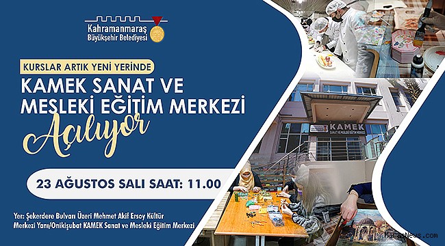 Kahramanmaraş Büyükşehir Belediyesi tarafından düzenlenen Meslek Edindirme ve Sanat Eğitimi Kursları’nın (KAMEK) yeni hizmet noktası açılıyor. Mehmet Akif Ersoy Kültür Merkezi yanında konumlandırılan “KAMEK Sanat ve Mesleki Eğitim Merkezi”, 23 Ağustos Salı günü saat 11.00’de gerçekleştirilecek törenle hizmete açılacak. Uzman eğitmenler tarafından 21 farklı branşta verilen eğitimler de açılışı gerçekleştirilecek yeni merkezinde kursiyerlerle buluşacak. Büyükşehir Belediyesi’nden yapılan açıklamada açılış törenine tüm vatandaşların davet edildiği bildirildi.