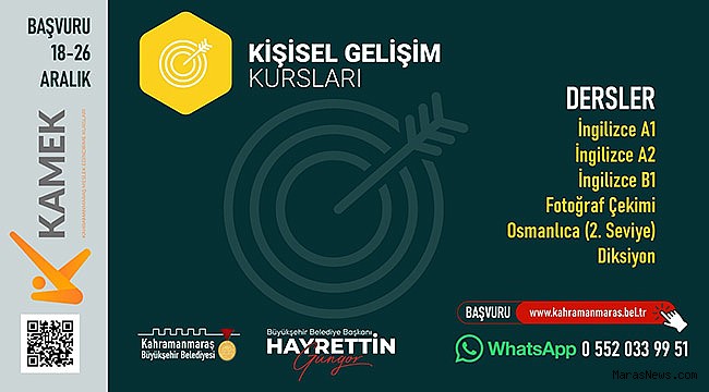 Kahramanmaraş Büyükşehir Belediyesinin her yıl düzenli olarak vatandaşlarla buluşturduğu Meslek Edindirme ve Sanat Eğitimi Kursları’nda (KAMEK) 30 farklı branşta eğitimler hızla sürerken; İngilizce A1, A2 ve B1, Osmanlıca, Fotoğraf Çekimi ve Diksiyon Kurslarında da başvurular başladı. 16 yaş ve üzeri vatandaşların katılım sağlayabileceği kurslara https://kahramanmaras.bel.tr/duyuru/2023/12/18/kamek-kurs-basvuru-formu internet adresinden çevrimiçi başvuru yapılabiliyor. Büyükşehir Belediyesinden yapılan açıklamada, 26 Aralık Salı gününe kadar devam edecek başvurulara ve kurslara ilişkin detaylı bilgiye 0552 033 99 51 numaralı WhatsApp Danışma Hattından ulaşılabileceği belirtildi.