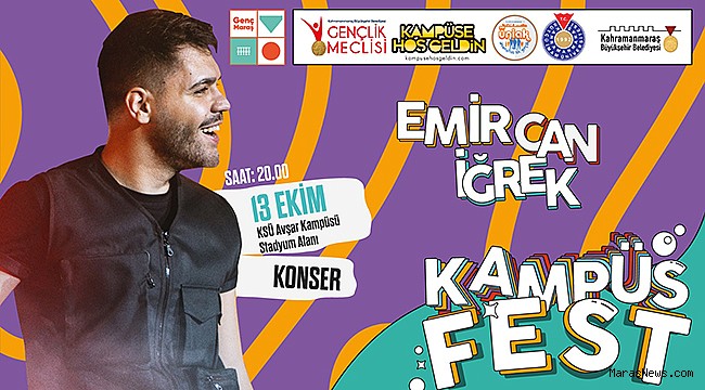 Kampüs Fest kapsamında ünlü sanatçı Emir Can İğrek de Kahramanmaraş’ta sahne alacak. KSÜ Avşar Kampüsü Stadyum Alanı’nda gerçekleştirilecek konser, saat 20.00’da başlayacak. Büyükşehir Belediyesi’nden yapılan açıklamada, ücretsiz olarak gerçekleştirilecek etkinliğe tüm müzikseverlerin davetli olduğu belirtildi.