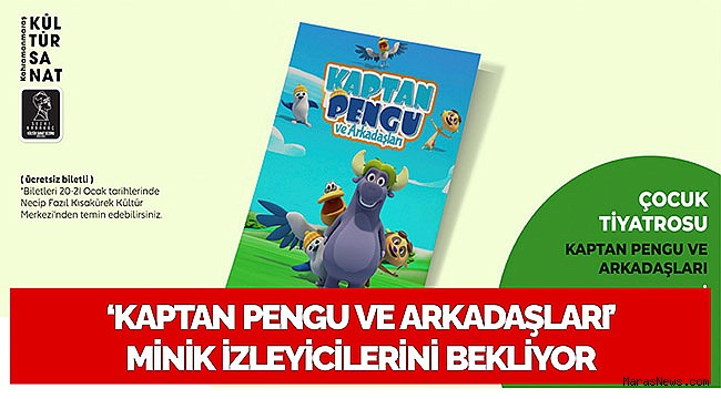 Kahramanmaraş Büyükşehir Belediyesi, Başkan Hayrettin Güngör öncülüğünde kültür sanat etkinlikleri kapsamında çocuklara yönelik faaliyetlerini artırarak sürdürüyor. Çocukların yarıyıl tatilini daha eğlenceli şekilde değerlendirmesine katkıda bulunmayı hedefleyen Büyükşehir Belediyesi, tatil boyunca şehir merkezi ve ilçelerde çeşitli tiyatro gösterilerini miniklerle buluşturacak. Etkinlik takvimi kapsamında, 21 Ocak Cumartesi günü TRT Çocuk lisanslı ‘Kaptan Pengu ve Arkadaşları’ adlı tiyatro gösterisi çocuklar için sahne alacak. Necip Fazıl Kısakürek Kültür Merkezi’nde gerçekleştirilecek gösteri saat 13.00 ve 15.00’da 2 seans şeklinde perdelerini açacak. TRT Çocuk ekranlarının sevilen karakterleri Kaptan Pengu ve arkadaşlarının eğlenceli müzikali; çevre kirliliği, su tasarrufu ve geri dönüşüm konularında da miniklere eğitici mesajlar verecek. Gösterinin biletleri, 20 ve 21 Ocak tarihlerinde Necip Fazıl Kısakürek Kültür Merkezi’nden ücretsiz olarak temin edilebiliyor. Büyükşehir Belediyesi’nden yapılan açıklamada, Kaptan Pengu ve arkadaşlarının maceralarını konu alan tiyatro gösterisine tüm çocukların davetli olduğu belirtildi.