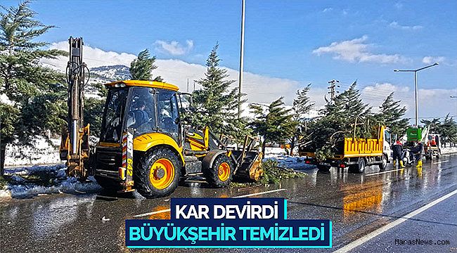 Kahramanmaraş Büyükşehir Belediyesi, tüm şehirde aniden etkili olan kar yağışıyla birlikte harekete geçti. Fen İşleri Dairesi Başkanlığı koordinesindeki ekipler, yoğun yağış sebebiyle kırılarak çevreye saçılan ağaç dallarını temizledi. İl genelinde onlarca noktada devrilen yüzlerce ağaca ve kırılan dallara müdahale eden ekiplere, budama platformları, yükleme kamyonları ve iş makinaları eşlik etti. Çalışmalarda, vatandaşlar için tehlike oluşturan dallar kesilerek güvenli hale getirildi. Gelen ihbarları değerlendiren ekipler, Necmettin Erbakan Bulvarı ve Onikişubat Bisiklet Yolu (Üngüt Mevkii) arasındaki 7 Kilometrelik arterde çalışmalarını tamamladı.