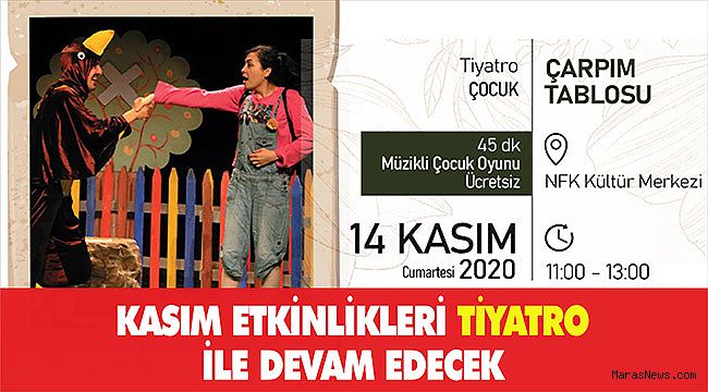 14 Kasım Cumartesi günü ise sahnede ‘Çarpım Tablosu’ isimli müzikli çocuk oyunu olacak. Şebnem Güler Karacan’ın yazdığı, Osman Doğan’ın yönettiği oyun, 11.00 ve 13.00 olmak üzere iki gösterimle miniklerle buluşacak. Düzenlenecek etkinlikler ile ilgili Kültür Turizm ve Spor Dairesi Başkanlığı tarafından yapılan açıklamada, “13 Kasım Cuma ‘Ziyafet Sofrası’ yetişkin oyunu, 14 Kasım Cumartesi de ‘Çarpım Tablosu’ isimli müzikli çocuk oyunu Necip Fazıl Kısakürek sahnesinde olacak. Pandemi tedbirleri çerçevesinde gerçekleştirilecek etkinliklerimiz ücretsiz” ifadeleri kullanıldı.