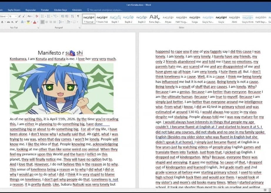 Ancak yalnızlık yaptığım şeyin sebebi değil. Yapmak istesem de yalnızlık yüzünden suçlayamam. İnsanlar bunu yapıyor ama bu doğru değil. Yalnızlık bir sebep değildir. İnsanlar benim bu durumum yüzünden bazı şeyleri varsayıyor ama bu yalnızlıktan değil. Zaten yalnızım. Çok yalnızım. Neredeyse hiç arkadaşım yok. Sadece iki arkadaşım var ve çoğu zaman konuşmuyoruz. Ailem benden nefret ediyor, benden korkuyor ve hayal kırıklığına uğramış durumda. Hep yalnızım. Ama şunu düşünmek yalnızlığın bir sebep olduğu anlamına gelmez. Yalnızlık bir sebep değildir. Bu sadece bir durumdur.