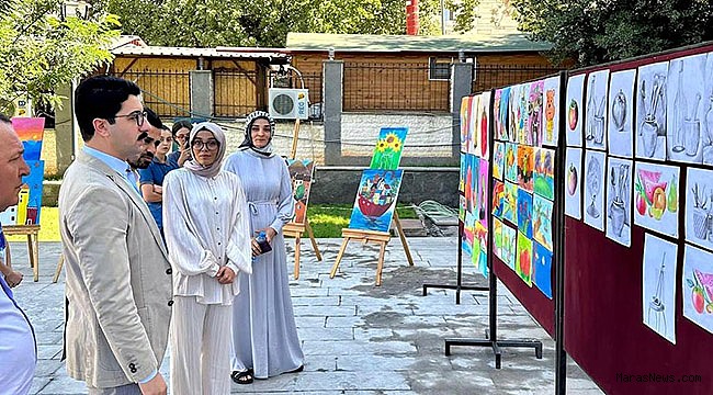 Pazarcık Hükümet Konağı bahçesinde Halk Eğitim Merkezi tarafından açılan Akrilik Boya ve Pastel Boya Resim sergisini ziyaret eden İlçe Kaymakamı Muhammed Kaya, öğretmen Şule Sarıaltun’dan bilgi aldı.