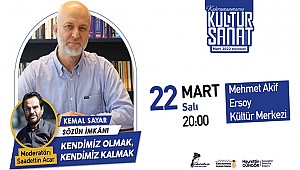 Kahramanmaraş Büyükşehir Belediyesi Mart Kültür Sanat Etkinlikleri hız kesmeden sürüyor. Etkinlikler kapsamında 22 Mart Salı günü (yarın) Yazar Prof. Dr. Kemal Sayar söyleşisi gerçekleştirilecek. Mehmet Akif Ersoy Kültür Merkezi’nde düzenlenecek etkinlikte ‘Kendimiz Olmak, Kendimiz Kalmak’ konusu usta yazar tarafından farklı açılardan ele alınacak. Moderatörlüğünü Saadettin Acar’ın yapacağı etkinlik saat 20.00’da başlayacak.