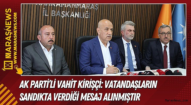 TBMM Tarım, Orman ve Köyişleri Komisyonu Başkanı ve Kahramanmaraş Milletvekili Vahit Kirişçi’nin yanı sıra Kahramanmaraş Büyükşehir Belediye Başkanı seçilen Fırat Görgel, İl Başkanı Cüneyt Doğan, Kahramanmaraş Büyükşehir Belediyesi eski Başkanı Hayrettin Güngör, Onikişubat Belediye Başkanı seçilen Hanifi Toptaş ve Dulkadiroğlu eski belediye başkanı Necati Okay’da hazır bulundu. Parti adına açıklamalarda bulunan TBMM Tarım, Orman ve Köyişleri Komisyonu Başkanı ve Kahramanmaraş Milletvekili Vahit Kirişçi, milletin iradesine saygı duyduklarını ve vatandaşların sandıkta vermiş olduğu mesajı aldıklarının altını çizdi.