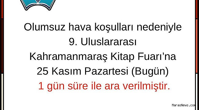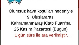 Kahramanmaraş Büyükşehir Belediyesi, olumsuz hava koşulları nedeniyle 25 Kasım Pazartesi günü (bugün) 9. Uluslararası Kahramanmaraş Kitap Fuarı’na ara verildiğini duyurdu. Büyükşehir Belediyesinden yapılan açıklamada, “Olumsuz hava koşulları nedeniyle 9. Uluslararası Kahramanmaraş Kitap Fuarı’na 25 Kasım Pazartesi günü (bugün) 1 gün süre ile ara verilmiştir” ifadelerine yer verildi. Anadolu’nun en büyük kitap fuarı, 26 Kasım Salı günü itibariyle tekrar edebiyatseverleri ağırlamaya devam edecek.