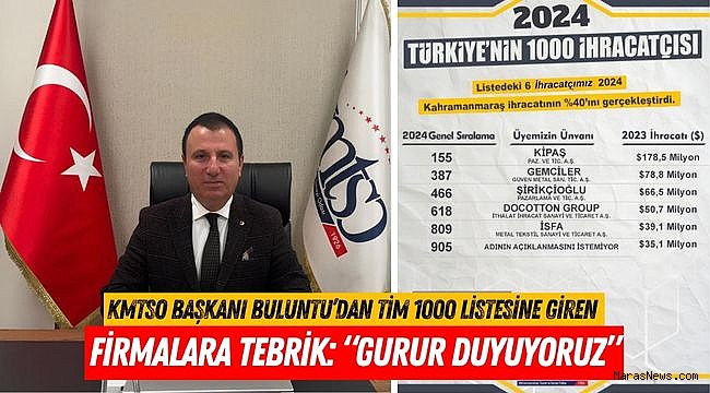 Konuya ilişkin değerlendirmelerde bulunan Kahramanmaraş Ticaret ve Sanayi Odası (KMTSO) Yönetim Kurulu Başkanı Mustafa Buluntu, şunları kaydetti: “Kahramanmaraş sanayisi her geçen gün daha da güçleniyor. Depremin ardından hızla toparlanarak üretime devam eden firmalarımız, bugün ulaştıkları ihracat başarılarıyla bizleri gururlandırdı. TİM 1000 listesine giren firmalarımızı ve emeği geçen tüm ihracatçılarımızı yürekten kutluyorum.”