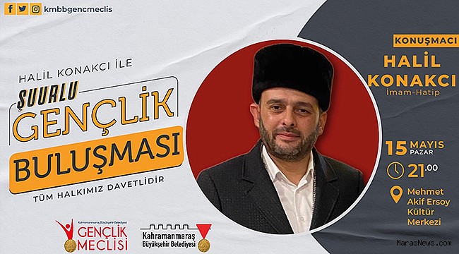 Kahramanmaraş Büyükşehir Belediyesi Gençlik Meclisi, sosyal faaliyetlerini aralıksız sürdürüyor. Şehirde özellikle gençlere yönelik çeşitli etkinliklere imza atan Gençlik Meclisi, şimdi de “Gençlik Buluşması” düzenliyor. Bu kapsamda, 15 Mayıs Pazar günü saat 21.00’de İmam – Hatip Halil Konakcı, Mehmet Akif Ersoy Kültür Merkezi’nde Kahramanmaraşlılarla bir araya gelecek. Gerçekleştirilecek etkinlik ile ilgili Büyükşehir Belediyesi Gençlik Meclisi Başkanı Abdulvahap Dertli, “Gençlik Meclisi olarak birbirinden renkli etkinliklerle hemşehrilerimizle bir araya gelmeye devam ediyoruz. Bu kapsamda, İmam – Hatip Halil Konakcı ile Gençlik Buluşması düzenliyoruz. Etkinliğimize tüm vatandaşlarımız davetlidir” dedi.