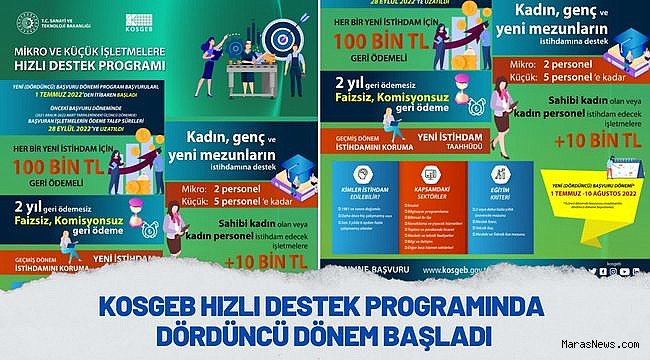 KOSGEB, Covid-19 salgınından etkilenen işletmelerde genç istihdamını kolaylaştıran “Mikro ve Küçük İşletmelere Hızlı Destek Programı”nın dördüncü başvuru dönemini açtı. Şartları taşıyan işletmeler, 10 Ağustos’a kadar online olarak başvurularını yapabilecek.