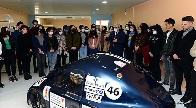 Lise öğrencileriyle birlikte KSÜ Mühendislik ve Mimarlık Fakültesi Teknoloji Geliştirme ve Uygulama Atölyesini gezen Rektör Can, atölyelerde geliştirilen ve TEKNOFEST kapsamında önemli dereceler elde eden elektromobil ve insansız su altı aracı hakkında yetkililerden bilgi aldı.