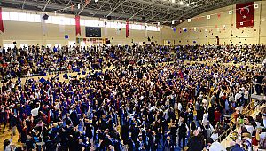 öğrencilerin hep birlikte mezuniyet andını okumaları ve ardından kep