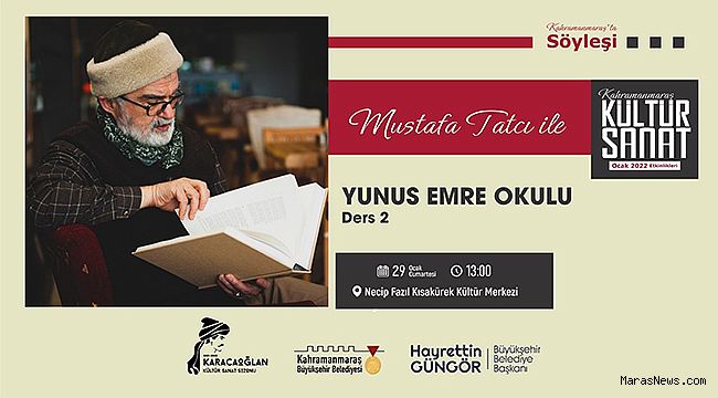 ahramanmaraş Büyükşehir Belediyesi tarafından düzenlenen Ocak Kültür Sanat Etkinlikleri devam ediyor. Farklı alanlarda birçok programın yer aldığı Kültür Sanat Sezonu 29 Ocak Cumartesi günü (yarın) düzenlenecek iki etkinlikle sürecek. Necip Fazıl Kısakürek Kültür Merkezi’nde düzenlenecek ilk etkinliğin konuğu Yazar Mustafa Tatcı olacak. Yazar Tatcı’nın gerçekleştireceği Yunus Emre Okulu adlı söyleşi saat 13.00’da başlayacak.