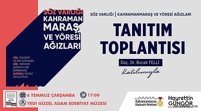 Kahramanmaraş Büyükşehir Belediyesi, şehrin kültür envanterine yeni eserler kazandırmaya devam ediyor. Bu kapsamda, Kahramanmaraş Sütçü İmam Üniversitesi Fen Edebiyat Fakültesi Öğretim Görevlisi Doç. Dr. Burak Telli tarafından kaleme alınan ve Kültür Yayınları’na kazandırılan ‘Söz Varlığı: Kahramanmaraş ve Yöresi Ağızları’ adlı sözlük türündeki eserin tanıtım programı gerçekleştirilecek. 6 Temmuz Çarşamba günü Doç. Dr. Burak Telli’nin katılımıyla Yedi Güzel Adam Edebiyat Müzesi’nde gerçekleştirilecek kitap tanıtım programı saat 17.00’de başlayacak. Kültür Spor ve Turizm Dairesi Başkanlığı’ndan yapılan açıklamada, Doç. Dr. Burak Telli’nin katılımıyla gerçekleştirilecek tanıtım programına tüm kitapseverlerin davet edildiği belirtildi.