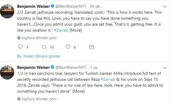 New York Times muhabiri Benjamin Weiser, bugünkü duruşmada yaşananlarla ilgili çarpıcı bilgiler aktardı. Mahkeme tutanaklarına giren Sarraf ve dayısı arasında geçen telefon görüşmesinde, "Burada işler böyle yürüyor. Bu ülke böyle. Bak, yapmadığın bir şeyi yaptığını söylemelisin. Suçunu kabul ettikten sonra özgürsün. Olay bu, özgür kalmak. Olanları yutacaksın." diye konuştukları tutanaklara geçti. Atilla'nın avukatları ise hakim Berman'a bu durumun, "Sarraf'ın yalan söylemeye razı olduğunu gösteriyor" dedi..