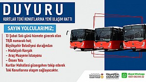Şehirde toplu taşıma standardını artırarak ulaşımı daha konforlu hale getirmek için faaliyetlerini sürdüren Kahramanmaraş Büyükşehir Belediyesi, şehrin yeni gelişim bölgesi Kurtlar Mahallesi’ndeki TOKİ Konutlarına ulaşım sağlayan yeni toplu taşıma hattını hizmete alıyor. 13 Şubat Salı günü hizmete başlayacak 78/B numaralı hat; Büyükşehir Belediyesi Durağından başlayıp Madalyalı Kavşak – Araç Muayene İstasyonu – Önsen Yolu - Kurtlar Mahallesi güzergâhını takip ederek TOKİ Konutlarına ulaşım sağlayacak. Büyükşehir Belediyesi’nden yapılan açıklamada; 13 Şubat Salı günü hizmete başlayacak 78/B numaralı Büyükşehir Belediyesi – Kurtlar TOKİ otobüslerinin hareket saatine https://kahramanmaras.bel.tr/toplu-tasima-guzergah-ve-saatleri internet adresi ve KahramanKart mobil uygulaması üzerinden ulaşılabileceği, toplu taşımaya ilişkin 0531 082 00 22 numaralı WhatsApp hattından bilgi alınabileceği belirtildi.