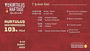Kahramanmaraş Büyükşehir Belediyesi, şehrin düşman işgalinden kurtuluşunun 103. yıl dönümü kutlamaları kapsamında 7 Şubat Salı günü de çeşitli etkinlikleri vatandaşlarla buluşturmaya devam edecek. 12 Şubat Kurtuluş Haftası kutlamaları kapsamında, Maraş’ın Milli Mücadelesini konu alan ‘Çatkapı Tiyatro’ adlı gösteri liselerde öğrencilerle buluşacak. Mehter Takımı da gün içerisinde üstü açık otobüs ile ana caddeler ve mahalleleri ziyaret ederek Kahramanmaraşlıları kutlama etkinliklerine davet edecek. Gün boyu mahallelerde davul zurna gösterileri de düzenlenecek. Saat 14.00’da ise Necip Fazıl Kısakürek Kültür Merkezi’nde ‘Kurtuluş’ temalı resim sergisinin açılışı gerçekleştirilecek. Büyükşehir Belediyesi’nden yapılan açıklamada, 12 Şubat Kurtuluş Haftası kutlama etkinlikleri takvimine https://kahramanmaras.bel.tr/duyuru/2023/02/01/kurtulus-haftasi-kutlama-etkinlikleri-takvimi adresinden ulaşılabileceği ve etkinliklere tüm vatandaşların davetli olduğu belirtildi.