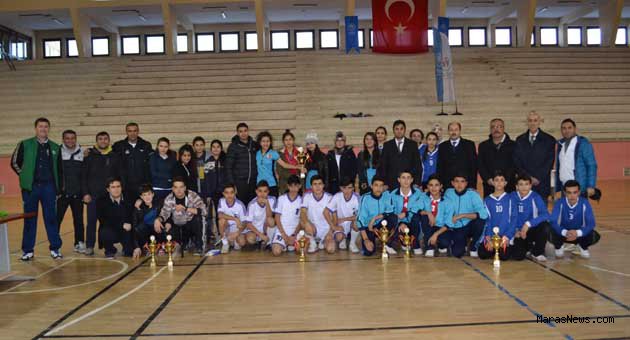 Elbistan Spor Salonu’nda düzenlenen turnuvanın sonunda dereceye giren okullara kupaları takdim edildi. (İHA)