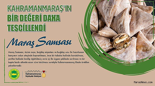 Şehrin yöresel lezzetlerini, geleneksel el sanatlarını ve kültürel değerlerini koruma altına almak için tescil başvurularını sürdüren Kahramanmaraş Büyükşehir Belediyesi, şehrin mutfak kültüründe önemli bir yere sahip olan Maraş Samsası’nı da Türk Patent ve Marka Kurumu’na tescil ettirdi. Büyükşehir Belediyesi, Sütçü İmam Üniversitesi Teknik Bilimler Meslek Yüksekokulu Gıda İşleme Bölümü ve İl Tarım ve Orman Müdürlüğü iş birliğiyle yapılan başvurunun ardından Maraş Samsası, Türk Patent ve Marka Kurumu tarafından yapılan incelemelerin ardından hazırlanan 143 Sayılı Resmi Coğrafi İşaret ve Geleneksel Ürün Adı Bülteni'nde yayımlanarak şehrin koruma altındaki ürünleri arasında yerini aldı. Mahalle Tarım ve Hayvancılık Dairesi Başkanlığı’ndan yapılan açıklamada, şehrin yöresel lezzetleri ve el sanatlarına sahip çıkılarak coğrafi işaret tescilli ürünlerin sayısının artırılacağı belirtildi.