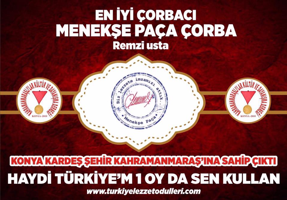 Türk Mutfağını tanıtmak ve yaşatmak amacıyla TÜRES tarafından organizasyonu gerçekleştirilen yarışmada; En İyi Çorbası Kategorisinde Kahramanmaraş’tan Menekşe Paça Çorba, En İyi Marka Kategorisinde MADO, En İyi Sütlü Tatlıcı Kategorisinde yine MADO yer aldı. En İyi Sokak Lezzeti Kategorisinde ise aslen Kahramanmaraşlı olup İstanbul’da iş yeri bulunan Sabırtaşı İçli Köftecisi yer aldı. Toplamda 24 kategori bulunan Türkiye Lezzet Ödülleri Yarışması’nda oylama 8 Mart’ta başladı. 30 Nisan’a kadar devam edecek olan oylama için her kategori için her gün 1 oy kullanma hakkı bulunuyor. Türkiye lezzet ödülleri yarışmasında oylamaya açılan kategoriler ise şöyle: