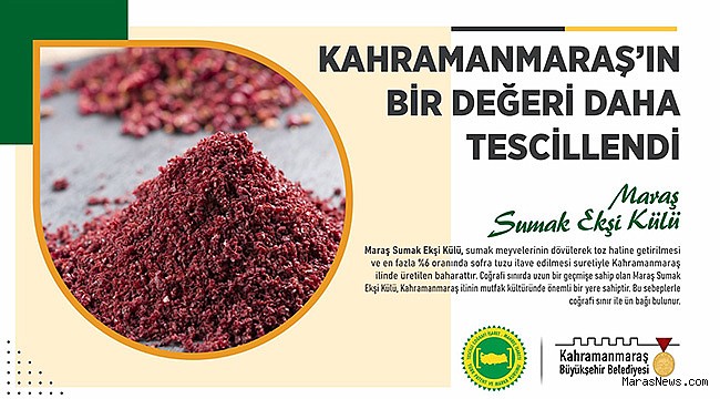 Kahramanmaraş’ın kültürünü, gelenek ve göreneklerini, yöresel lezzetlerini ve geleneksel el sanatlarını koruyarak gelecek nesillere aktarmak için faaliyetlerini sürdüren Kahramanmaraş Büyükşehir Belediyesi, Kahramanmaraş Çiriş Böreği’nin ardından Maraş Sumak Ekşi Külü’nün de tescilini aldı. KSÜ Teknik Bilimler Meslek Yüksekokulu Gıda İşleme Bölümü ve İl Tarım ve Orman Müdürlüğünün de katkılarıyla Büyükşehir Belediyesi tarafından yapılan başvurunun ardından Maraş Sumak Ekşi Külü, Türk Patatent ve Marka Kurumunca hazırlanan 176 sayılı Resmi Coğrafi İşaretler ve Geleneksel Ürün Adı Bülteni’nde yayımlanarak şehrin 30’uncu tescilli ürünü olarak yerini aldı. Tarımsal Hizmetler ve Muhtarlıklar Dairesi Başkanlığından yapılan açıklamada: “Yöresel lezzetlerimize ve geleneksel el sanatlarımıza sahip çıkarak coğrafi işaret tescilli ürünlerimizin sayısını artırmak için çalışmalarımızı sürdürüyoruz” ifadelerine yer verildi.