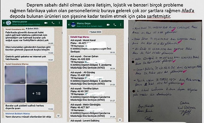 Toplamda 2 ve 3’cü gün 18 tır suyu verdik. Suları, Jandarma ve AFAD koordinesinde nereye dedilerse gönderdik. Bizim işçilerimiz Antalya'dan Bolu'ya kadar, Ankara'ya kadar, Kırşehir, Nevşehir'e kadar yayılmıştı, onları çağırdık. Yatacak yer ayarladık, yiyecek ayarladık. Kar altında kendi ellerimizle tesisi temizledik. Burada 2 ay biz bahçede yattık. 20 gün boyunca su üretemedik. 20 günden sonra personel sıkıntımız vardı yani biz mart ayı boyunca da randımanlı bir üretim yapamadık. Depremde ve daha sonraki artçılarda su bulandı, su bulanık olduğu zaman üretim yapamadık. Biz imkanımız ölçüşünce halkımızın yanında olduk, çok büyük fedakarlık yaptık. O günlerde dışarıdan çok yardım suları geldi. Bu çok doğal. Biz de Kastamonu'da sel olduğunda su gönderdik. Biz Bursa'da veya Ankara'da olsaydık daha fazla su gönderebilirdik, fakat bizde depremzedeyiz. O gün dışarıdan gelen sular o kadar fazla geldi ki refüjlere bıraktılar. İnsanlar artık bize su göndermeyin, battaniye verin, ısıtıcı verin, yiyecek gönderin diyorlardı. Fabrikadaki arıza ve kaynaktaki suyun bulanık olması nedeniyle depomuzdaki suları verdikten sonra tekrar üretime geçebilmek için birçok faktör vardı. Elektrik yoktu. AKEDAŞ'a 10 günde elektriği zor açtırdık. Tesis binamızın hasar durumunu tespit ettirmek lazımdı. Bu bir süreçti. Burada boru patlamış o boruyu neresinden patladığını bir cihazla bakıp tamir etmek gerekiyordu. Makinalarımız yerinden oynamış, onların bir parçasını Ankara'da tamir ettirip, bir parçasını yurt dışından getirdik. Sosyal medyada maalesef kulaktan dolma başka duygularla böyle bir linç yedik, yemeye devam ediyoruz. Ama biz halkımızdan empati bekliyoruz, anlayış bekliyoruz. Biz de depremzedeyiz, biz vicdanen rahatız, çok ciddi fedakârlık yaptık. Birçok insanlar ‘ben artık burada yaşamam’ diye gitti. Biz ne yaptık? Biz burada kendi yiyeceğimizi, yatacağımızı, çadırımızı kurduk, yemek yaptık, yeri geldi bulaşık yıkadık. Her şeyimizi kendimiz ayarladık. Tesisimizde çalışan personellerimizin aileleri dışına gitmek zorunda kaldı. Bizler tesis bahçemizde iki ay boyunca mücadele verdik.” diye konuştu.