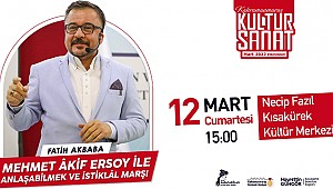 Kahramanmaraş Büyükşehir Belediyesi Mart Kültür Sanat Etkinlikleri kapsamında düzenlenen programlar hız kesmeden devam ediyor. Bu kapsamda, tiyatro gösterilerinden söyleşiye, konserden konferansa kadar pek çok etkinlik ay boyunca kültür sanat dostlarıyla buluşacak. Etkinlik takvimi kapsamında, 12 Mart Cumartesi günü (yarın) Fatih Akbaba ile ‘Mehmet Akif Ersoy ile Anlaşabilmek ve İstiklal Marşı’ adlı söyleşi etkinliği gerçekleştirilecek. Necip Fazıl Kısakürek Kültür Merkezi’nde düzenlenecek etkinlik saat 15.00’da başlayacak.