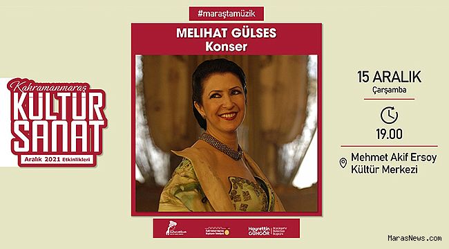 Kahramanmaraş Büyükşehir Belediyesi tarafından düzenlenen Aralık Kültür Sanat Etkinlikleri, birbirinden ünlü isimleri sanatseverlerle buluşturmaya devam ediyor. Takvim kapsamında, Klasik Türk Müziği’nin unutulmaz ismi Melihat Gülses ile konser programı düzenlenecek. 15 Aralık Çarşamba günü (bugün) saat 19.00’da Mehmet Akif Ersoy Kültür Merkezi’nde gerçekleştirilecek konserde, “Çok Aşığın Var Diyorlar”, “Kapın Her Çalındıkça”, “Göçmen Kızı” gibi eşsiz eserler kulakların pasını silecek. Kültür Spor ve Turizm Dairesi Başkanlığı’ndan yapılan açıklamada, ücretsiz etkinliğe tüm vatandaşların davet edildiği bildirildi.