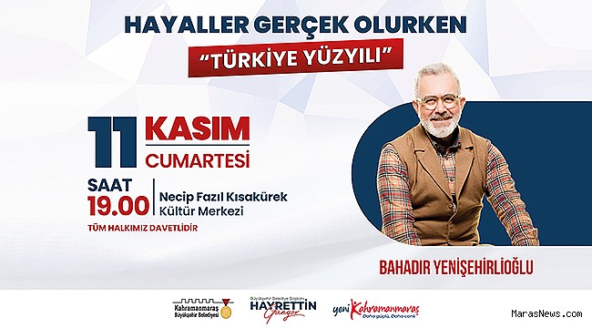 Şiir ve edebiyatın başkentinde aylık kültür sanat etkinliklerini kesintisiz sürdüren Kahramanmaraş Büyükşehir Belediyesi, Kasım Kültür Sanat Sezonu’nun ilk programında AK Parti Grup Başkanvekili Bahadır Yenişehirlioğlu’nu konuk edecek. 11 Kasım Cumartesi günü Necip Fazıl Kısakürek Kültür Merkezi’nde gerçekleştirilecek programda Yenişehirlioğlu, ‘Hayaller Gerçek Olurken - Türkiye Yüzyılı’ konusunu ele alacak. Saat 19.00’da başlayacak programa tüm Kahramanmaraşlılar davet edilirken Büyükşehir Belediyesinden yapılan açıklamada, Kasım Kültür Sanat Takvimi’ne https://kahramanmaras.bel.tr/duyuru/2023/11/06/kasim-ayi-kultur-sanat-takvimi internet adresinden ulaşılabileceği belirtildi.