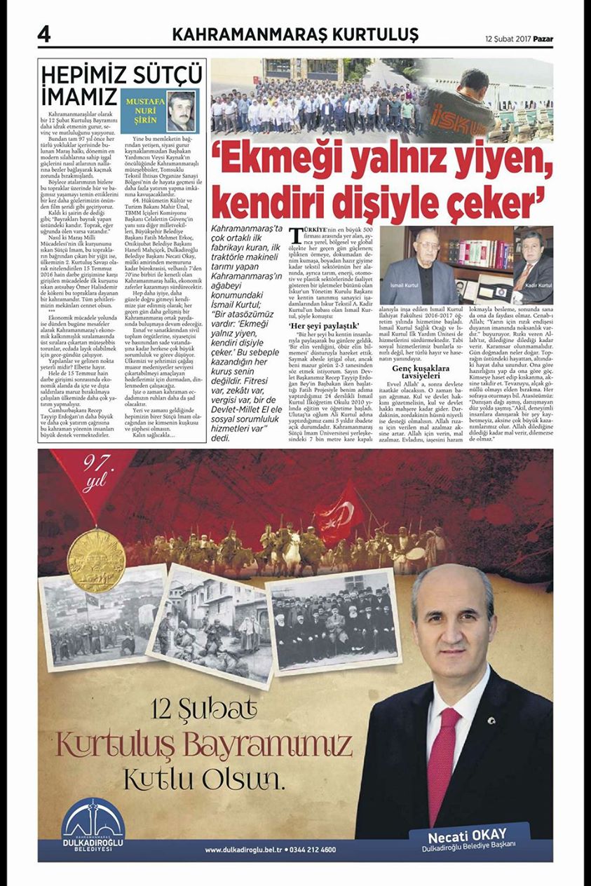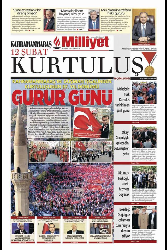 Gazete ile birlikte tablet ve internet ortamında da okuyuculara sunulan Kahramanmaraş 12 Şubat Kurtuluş ekinde; siyasiler, kamu kurum ve kuruluşları ile bazı belediye yöneticilerinin yanı sıra Kahramanmaraş ekonomisine yön vererek milli gelir ve istihdama önemli katkılarda bulunan bazı özel sektör temsilcilerinin tanıtım haberleri yer alıyor.