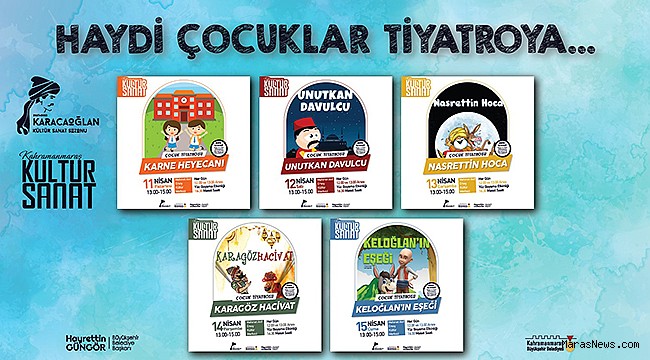 Büyükşehir Belediyesi tarafından birbirinden eğlenceli tiyatro gösterileri hafta boyunca çocuklarla buluşturulacak. Etkinlik takvimi kapsamında, 11 Nisan Pazartesi günü Karne Heyecanı, 12 Nisan Salı günü Unutkan Davulcu, 13 Nisan Çarşamba günü Nasrettin Hoca, 14 Nisan Perşembe günü Karagöz – Hacivat ve 15 Nisan Cuma günü Keloğlan’ın Eşeği adlı çocuk tiyatroları minik izleyicileriyle buluşacak. Tiyatro gösterilerin tamamı 13.00 ve 15.00’de iki seans şeklinde sahnelenecek. Mehmet Akif Ersoy Kültür Merkezi’nde sahnelenecek oyunların biletleri yine aynı noktadan ücretsiz olarak temin edilebilecek.