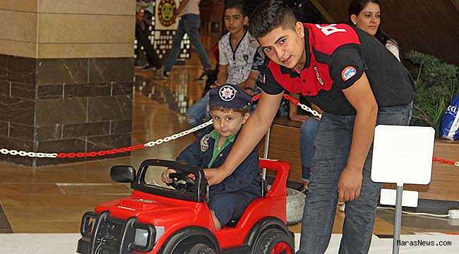 polis kıyafeti giyip akülü araçlarla hem trafik kurallarını öğrenecek hem de