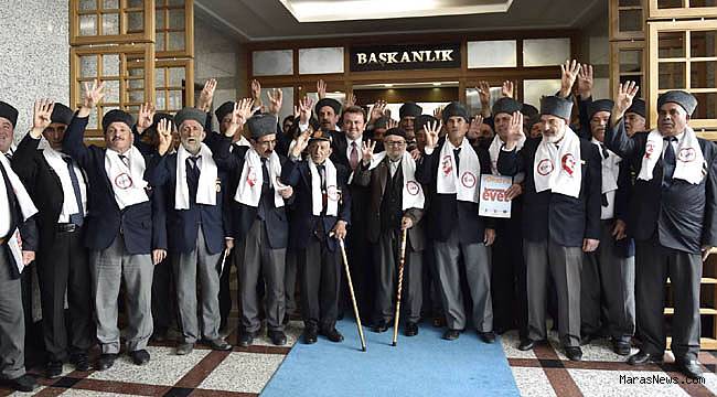 Başkanlık Makamında gerçekleşen ziyarette Muharip Gaziler Derneği Kahramanmaraş Şube Başkanı Tayfun Özbek: “Tek Millet, Tek Bayrak, Tek Vatan, Tek Devlet için Türkiye’yi seviyoruz ve bunun için Cumhurbaşkanlığı Sistemine Evet diyoruz. Cumhurbaşkanımız Cumhurun Başı Sayın Recep Tayyip Erdoğan ve Büyükşehir Belediye Başkanımız Sayın Fatih Mehmet Erkoç’un çağrısı üzerine Kahramanmaraş’ta yaşayan Muharip Gaziler olarak ‘evet’ diyoruz” diye konuştu.