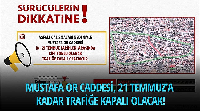 Binevler Bölgesi Cadde Yenileme Projesi kapsamında bölgede çalışmalarını sürdüren Kahramanmaraş Büyükşehir Belediyesi, Mustafa Or Caddesi’nde gerçekleştirilecek asfalt çalışmaları dolayısıyla arterin 18 – 21 Temmuz tarihleri arasında çift yönlü olarak trafiğe kapalı olacağını duyurdu. Ulaşım Dairesi Başkanlığı’ndan yapılan açıklamada; çalışmalar esnasında aksamalara neden olmaması adına caddeye araç park edilmemesi, trafikte herhangi bir olumsuzlukla karşılaşılmaması için trafik işaret ve işaretçilerine dikkat edilmesi ve ulaşımda alternatif güzergâhların kullanılmasının önem arz ettiği belirtildi.