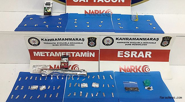 Kahramanmaraş il merkezine Uyuşturucu ticareti ve sokak satıcılarına yönelik yapılan operasyonda; sokak satıcıları narkotik madde satarken suçüstü yakalandı. Yapılan aramalarda 3 kişi üzerinden 1 paket 4,41 gram esrar, 4 satıcı üzerinden ve ikametlerinde satışa hazır 1 paket 0,83 gram esrar, satışa hazır 55 paket 6,10 gram metamfatamin ve 66 adet captagon sentetik hap ve aleminyüm folyo ele geçirildi. Olayla ilgili gözaltına 4 kişi Kadir Ö., Şükrü B., Mikail G.ve Fatih N. isimli şahıslar Emniyet Müdürlüğüne götürüldü.
