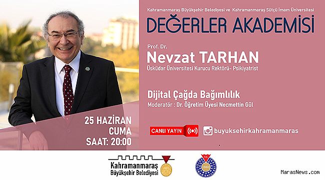 Kahramanmaraş Büyükşehir Belediyesi’nin düzenlediği Değerler Akademisi çevrimiçi özel programında, 25 Haziran Cuma günü Prof. Dr. Nevzat Tarhan’ın konuk olacak.