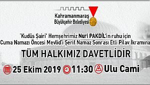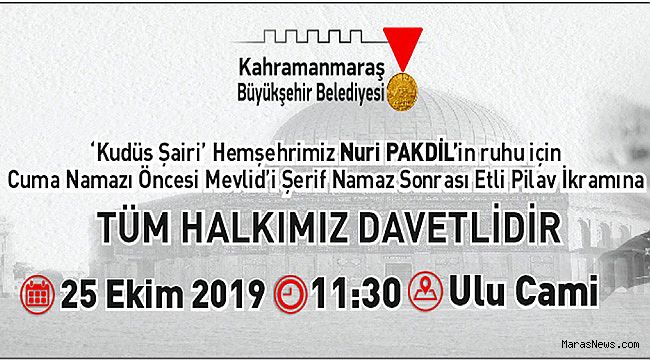 Kahramanmaraş Büyükşehir Belediyesi merhum Yazar Nuri Pakdil için Ulu Cami’de Mevlid-i Şerif okutacak. Büyükşehir Belediyesi Sağlık ve Sosyal Hizmetler Dairesi Başkanlığından yapılan açıklamada; “Merhum Yazar Nuri Pakdil için 25 Ekim Cuma saat 11.30’da, Ulucami’de Mevlid-i Şerif okutulacaktır. Tüm hemşerilerimiz davetlidir” denildi.