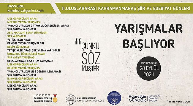 Kahramanmaraş Büyükşehir Belediyesi tarafından düzenlenecek “2. Uluslararası Şiir ve Edebiyat Günleri” yarışmaları kapsamında iki önemli değişikliği duyuruldu. Kısa film, müzik, resim, şiir okuma ve yazma, deneme ve mektup başta olmak üzere toplamda 14 alanda yapılacak yarışmaların başvuru süresinde süre uzadı. Yoğun talep dolayısıyla yapılan değişiklikle birlikte çevrimiçi olarak gerçekleştirilen başvurularda son tarih 28 Eylül Salı günü olarak açıklandı. Adaylar son başvuru tarihine kadar www.kmedebiyatgunleri.com adresi üzerinden form doldurarak yarışmalara katılabilecek.
