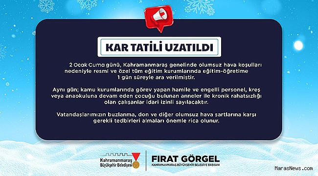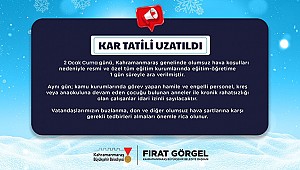 Şehir genelinde etkisini artırarak sürdüren yoğun kar yağışı nedeniyle 2 Ocak Cuma günü resmi ve özel tüm eğitim kurumlarında eğitime 1 gün süreyle ara verildi. Eğitime verilen aranın yanı sıra, kamu kurum ve kuruluşlarında görev yapan bazı personeller için de idari izin uygulaması hayata geçirildi. Alınan karar doğrultusunda; hamile personeller, engelli çalışanlar, kreş veya anaokuluna devam eden çocuğu olan anneler ile kronik rahatsızlığı bulunan kamu çalışanları da 2 Ocak Cuma günü idari izinli sayılacak.
