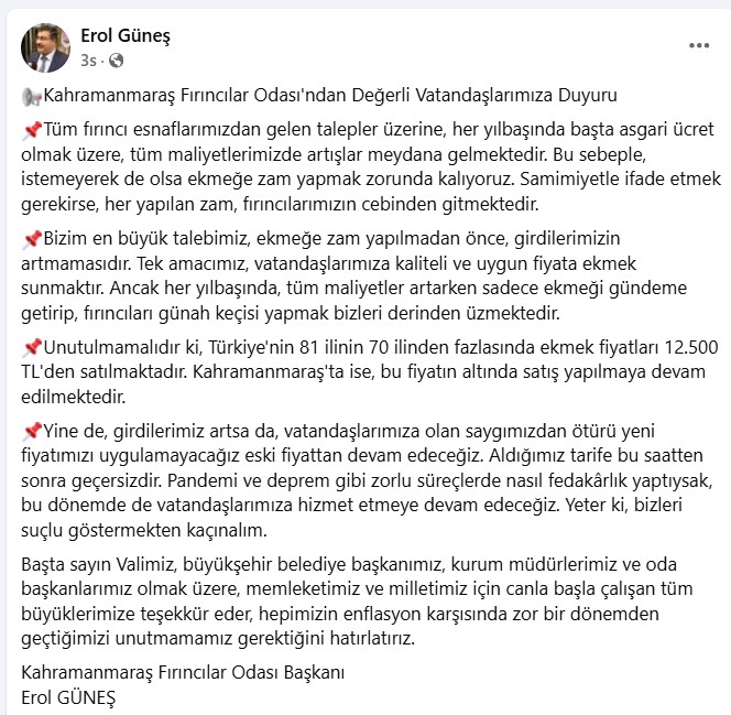 Türkiye'nin 81 ilinin 70'inden fazlasında ekmek fiyatlarının 12.50 TL'den satıldığını belirten Güneş, Kahramanmaraş'ta ise bu fiyatın altında satış yapılmaya devam edildiğini vurguladı.