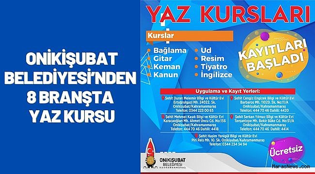 Standart belediyecilik hizmetlerinin yanı sıra üstlendiği sorumlulukla eğitim yatırımlarında dikkat çeken çalışmalara imza atan Hanefi Mahçiçek başkanlığındaki Onikişubat Belediyesi, pozitif ayrımcılık ilkesiyle ilçedeki öğrenci ve gençlere birbirinden anlamlı hizmetleri ulaştırıyor. Çocukların kişisel gelişimlerinde yeni ufuklar açan yaz kurslarını bu yıl da devam ettiren Onikişubat Belediyesi, yeni dönemin kayıtlarını almaya başladı. Bağlama, gitar, keman, kanun, ud, resim, tiyatro ve İngilizce gibi sanatsal ve kişisel gelişim branşlarında gerçekleştirilecek olan yaz kurslarına 7 yaş ve üzeri katılımlar kabul edilecek. Kurslarla yaz tatilini dolu dolu geçirecek olan öğrenciler, hem eğlenecek hem de öğrenecek. Yaz tatili ile sınırlı kalmayıp 12 ay boyunca devam edecek ve tamamen ücretsiz olacak kurslara katılmak isteyenler, aşağıda adres ve telefon numaraları yazılı olan Bilgi ve Kültür Evlerimize bizzat giderek ya da arayarak başvuru yapabilecek.