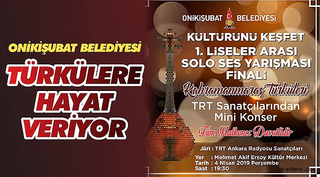 Öte yandan yarışmanın finalinde mini bir konser gerçekleştirilerek, birbirinden değerli TRT sanatçıları sahne alacak. Onikişubat Belediyesi tarafından organizasyonu gerçekleştirilen 1. Liseler Arası Solo Ses Yarışmasına tüm vatandaşlar davet edildi.