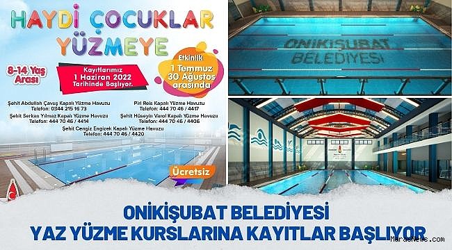 Yaz Yüzme Kursları’na kayıtlar 1 Haziran Çarşamba günü başlayacak. Kurs boyunca, uzman eğiticiler ve cankurtaranlar çocuklara eşlik edecek. Kurslar, 1 Temmuz ile 30 Ağustos tarihleri arasında yapılacak. Yaz Yüzme Kursu’na katılmak isteyenler; Şehit Abdullah Çavuş Kapalı Yüzme Havuzu için (0344) 215 16 73, Şehit Serkan Yılmaz Kapalı Yüzme Havuzu için 444 70 46 – 4414, Piri Reis Kapalı Yüzme Havuzu için 444 70 46 – 4417, Şehit Hüseyin Varol Kapalı Yüzme Havuzu için 444 70 46 – 4406, Şehit Cengiz Engizek Kapalı Yüzme Havuzu için ise 444 70 46 – 4420 numaralı telefondan detaylı bilgiye ulaşabilecek.
