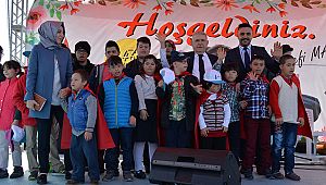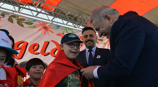 Konuşmaların ardından çocuklarını sahneye davet eden