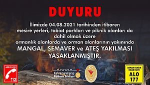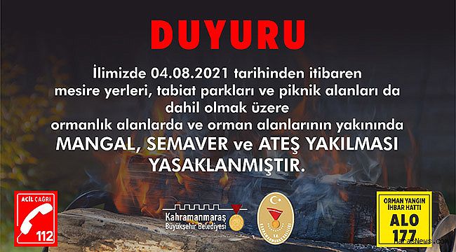Bir süredir meydana gelen orman yangınlarının önlenmesi amacıyla kent genelinde ormanlık alanlarda veya yakınlarında ateş yakılmamasına ilişkin karar alındı. Kahramanmaraş Valiliği’nin 2021/4 sayılı kararı gereğince alınan tedbirler, Kahramanmaraş Büyükşehir Belediyesi’ne bağlı mesire ve piknik alanları dâhil tüm orman arazileri için geçerli olacak. 4 Ağustos Çarşamba (bugün) itibariyle uygulamaya konan karar kapsamında, ormanlık bölgeler veya yakınlarında semaver ve mangal dâhil ateş yakılmaması isteniyor. Yapılan açıklamada, vatandaşların alınan karara aykırı bir davranışla karşılaşmaları halinde 112 Acil Çağrı Merkezi’ne ya da 177 Alo Yangın İhbar Hattı’na çağrıda bulunabileceği bildirildi.