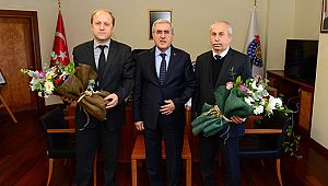 Rektör Can, Kahveci ve Akyüz’e çiçek takdim etti.