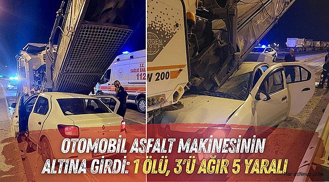 Edinilen bilgiye göre, Kahramanmaraş'tan Gaziantep istikametine seyir halinde olan otomobil direksiyon hakimiyetini kaybederek asfalt makinesinin altına girdi. İhbar üzerine bölgeye çok sayıda itfaiye sağlık ve polis ekipleri sevk edildi. Olay yerine gelen ekipler asfalt makinasına giren otomobilde sıkışan yararları çıkartarak şehir hastanesine sevk ettiler. Kazada 70 yaşındaki Sabiha İnan olay yerinde hayatını kaybetti. Hüsnü, Sıdıka ve Necla İnan ise ağır yaralandı. Otomobilde bulunan Büşra ve İkra İnan isimli çocuklar ise hafif yaralandılar. Kazada yaralanan 3 kişinin sağlık durumu ciddiyetini korurken çocuklar ayakta tedavi ediliyor. Hayatını kaybeden Sabiha İnan'ın cesedi ise otopsi yapıldıktan sonra, sahiplerine teslim edilecek.